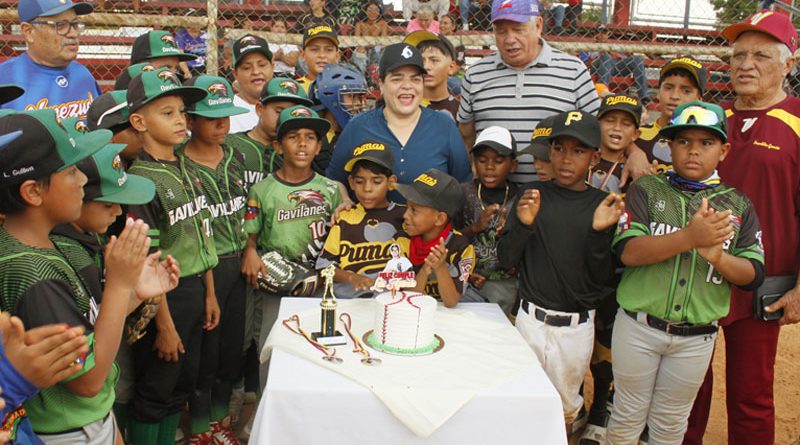 El acto central tuvo lugar en el estadio La Chamarreta donde peloteritos de los equipos Gavilanes y Pumas, cantaron el cumpleaños y disfrutaron de la torta con toda la familia de la Pequeña Liga en formación, Judith de Negrette.