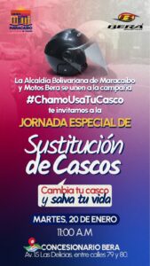Bajo el lema «Cambia tu casco, salva tu vida», la Alcaldía de Maracaibo, en conjunto con Motos Bera realizará este martes 20 de enero una jornada especial de sustitución de cascos.