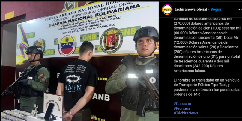 De acuerdo a una información difundida mediante la red social Instagram, un sujeto fue detenido en el estado Táchira por transportar la cantidad de 342 mil dólares falsos.