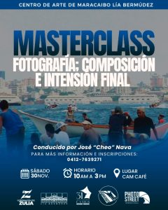 El Centro de Arte de Maracaibo Lía Bermúdez se complace en anunciar una exclusiva Master Class de Fotografía titulada «Composición e Intención Final», que se llevará a cabo el próximo sábado 30 de noviembre, desde las 10:00 am hasta las 3:00 pm. Este evento está diseñado para estudiantes, fotógrafos y aficionados que deseen profundizar en el arte de la fotografía bajo la guía del reconocido fotógrafo José «Cheo» Nava.