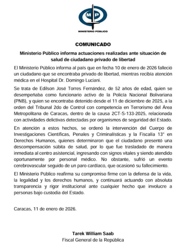 El Ministerio Público (MP) confirmó la muerte de Edilson José Torres Fernández, de 52 años, funcionario activo de la Policía Nacional Bolivariana (PNB) quien se encontraba bajo custodia desde el 11 de diciembre de 2025, según citó la agencia Internacional EFE Noticias.