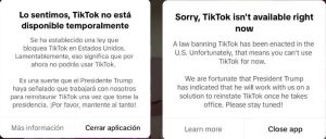 «Lamentamos informarles que una ley de EE.UU. que prohíbe TikTok entrará en vigor el 19 de enero y nos obligan a hacer que nuestros servicios no estén disponibles temporalmente. Estamos trabajando para restaurar nuestro servicio en EE.UU. tan pronto como sea posible y apreciamos su apoyo. Sigan atentos», reza el mensaje de la red social.